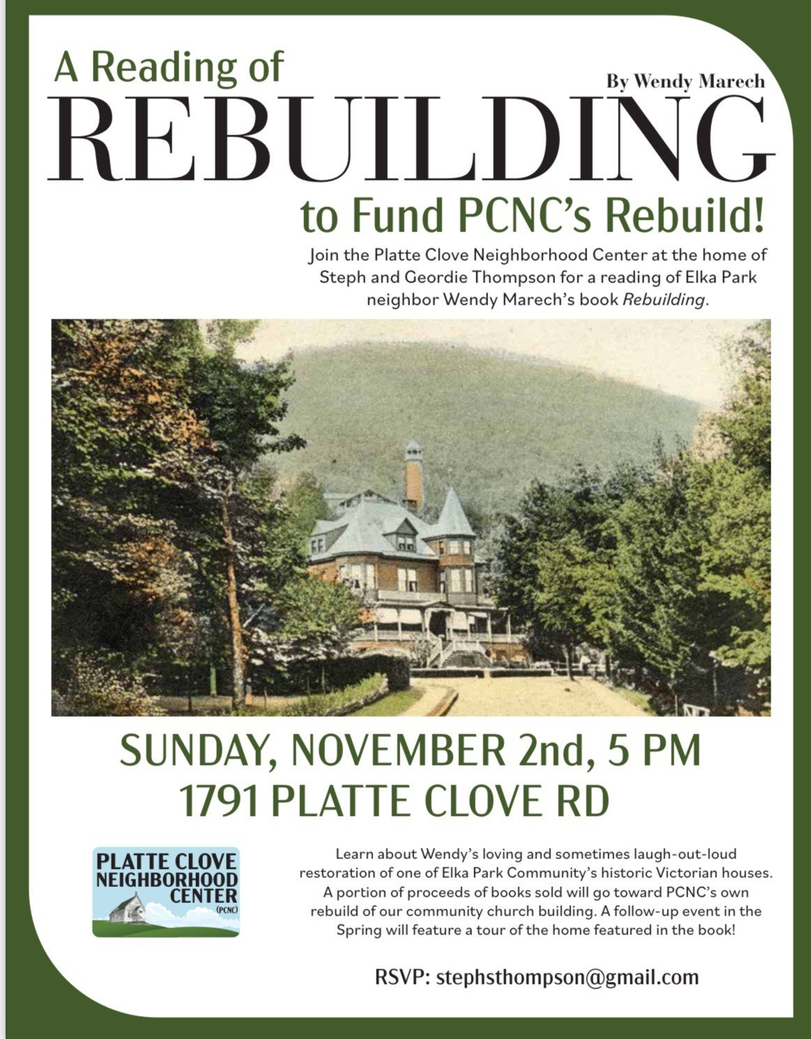 Stephanie & Gerodie Thompson are hosting a reading with Wendy Marech from her book “Rebuilding”. Address: 1791 Platte Clove rd.